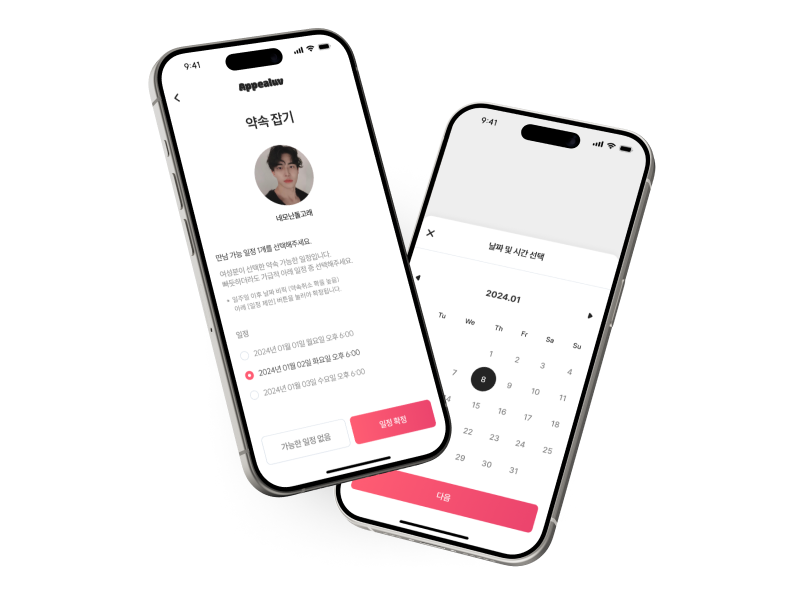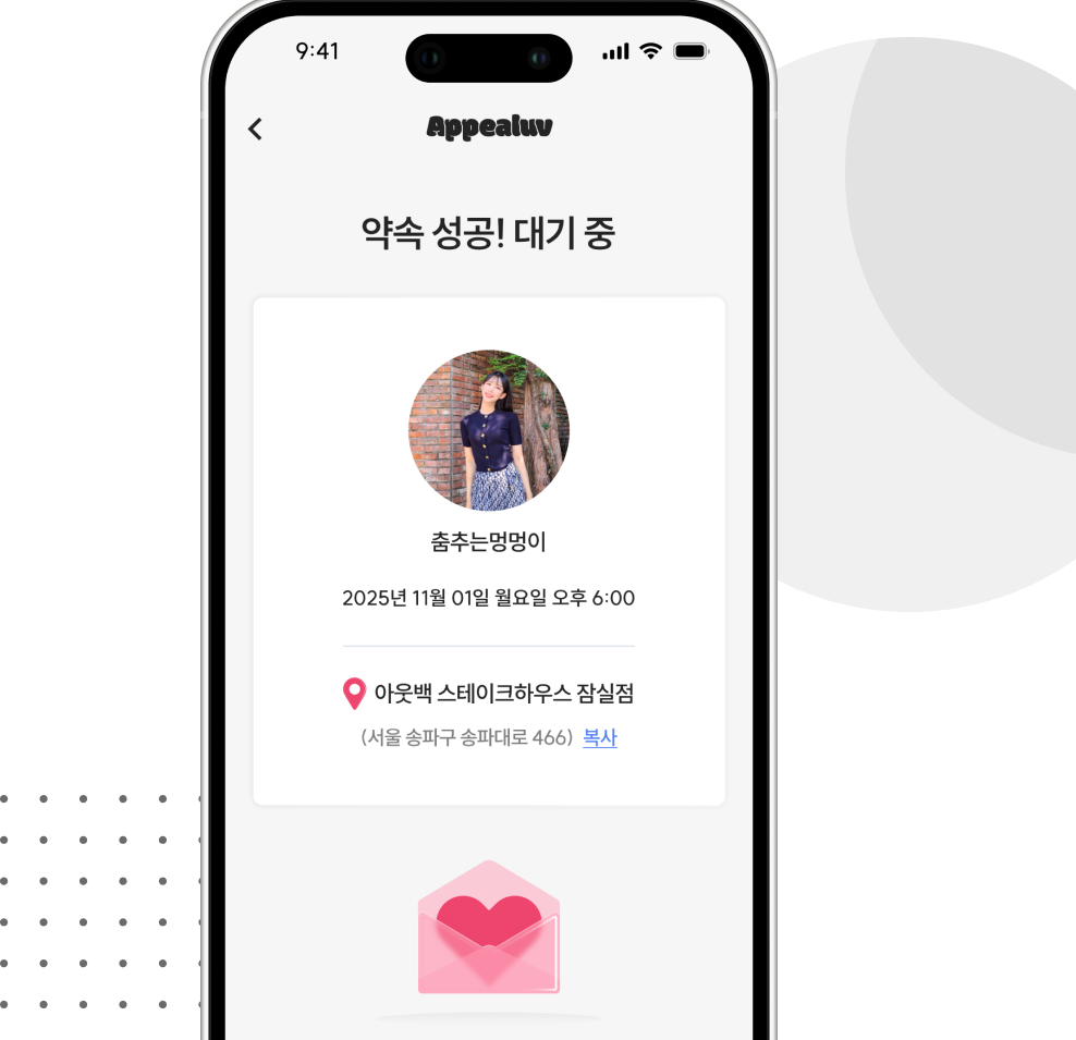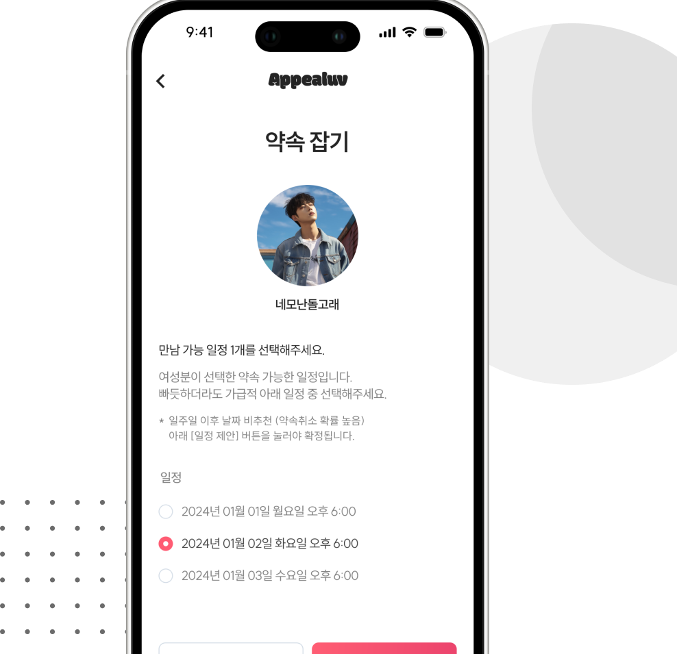 남녀회원이 서로 '수락'하면 매칭이 확정됩니다. 선호 시간과 약속 장소를 조율하고 만남을 확정합니다.