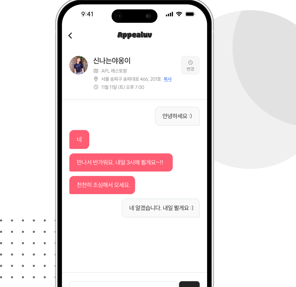약속일 2일 전에 간략히 확인톡을 진행합니다. 약속일에 실제 만남을 통해 서로를 알아갑니다.